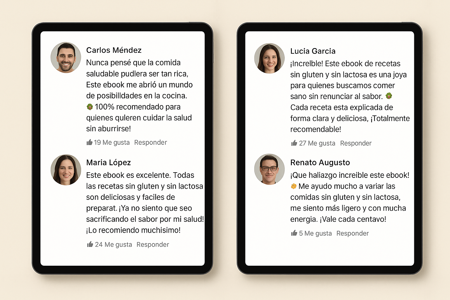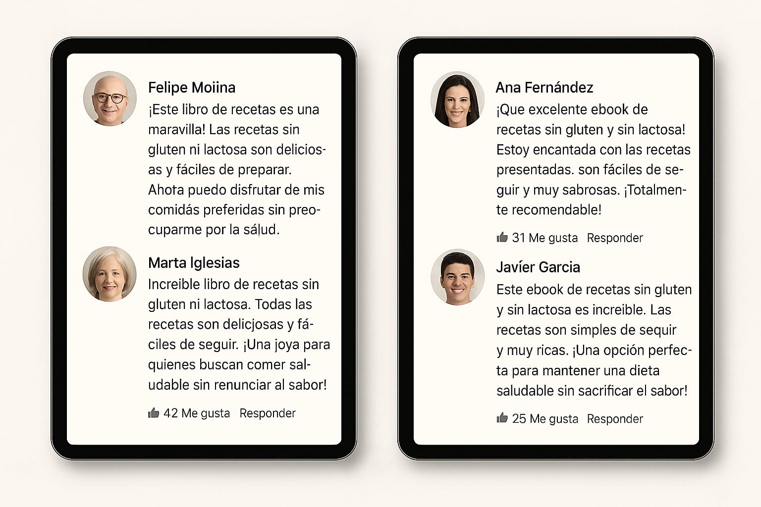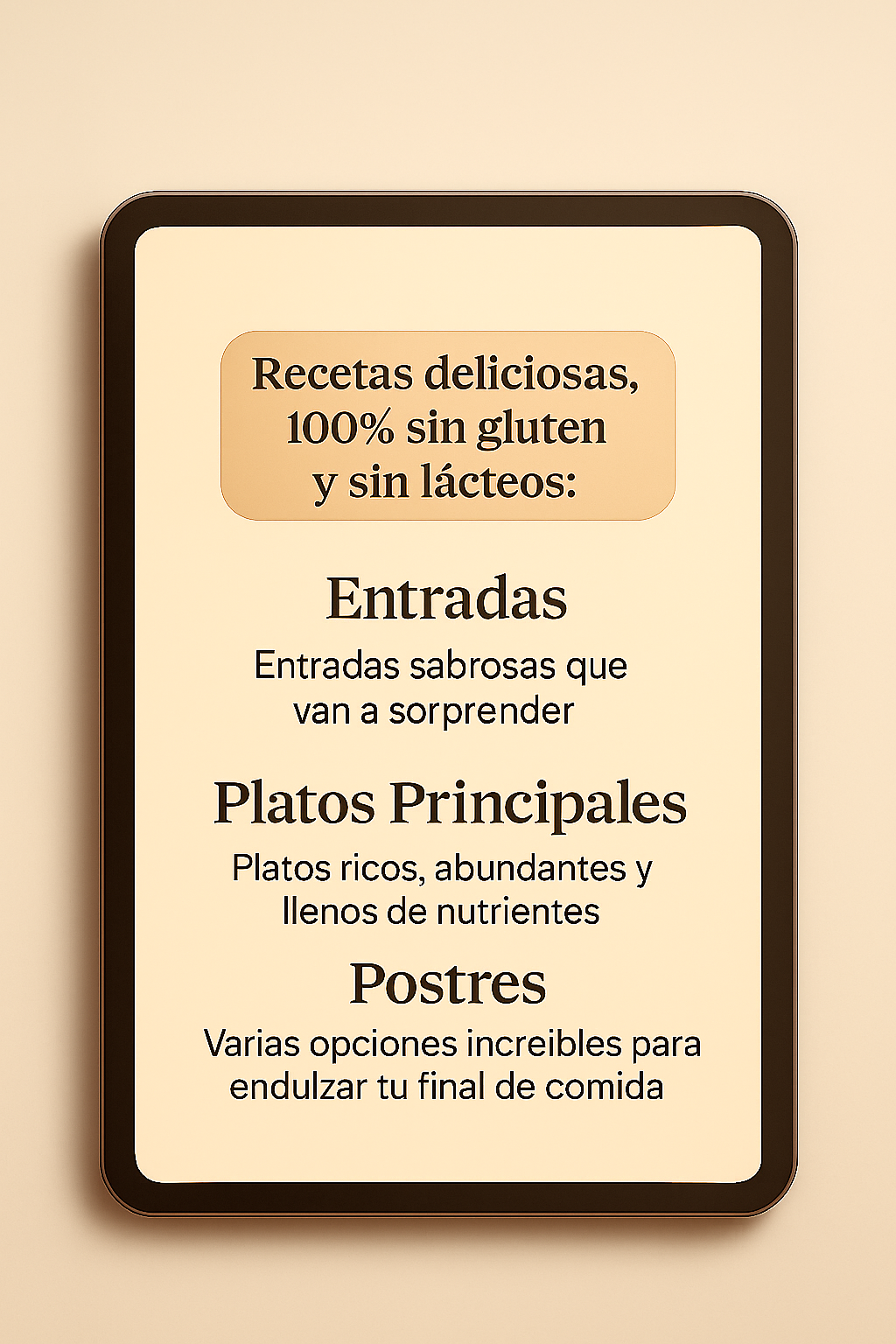 ¡Sí! Todas las recetas están pensadas para ser saludables, sin gluten y sin lactosa, ideales para quienes tienen restricciones alimentarias sin renunciar al sabor. - ¿Puedo imprimir el ebook?